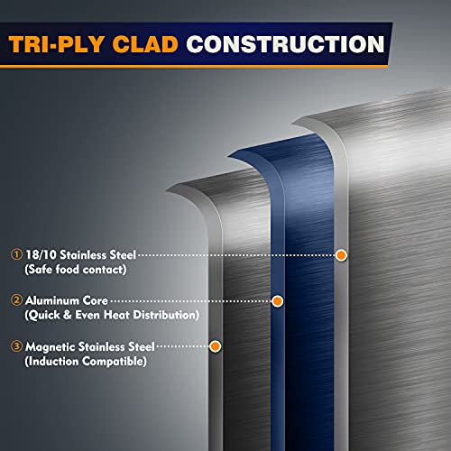 TRI-PLY CLAD CONSTRUCTION: Three layer stainless steel with encapsulated aluminum core not only ensures the thickness and heavy weight but also distributes heat throughout the entire pot that effectively eliminating hot spots.