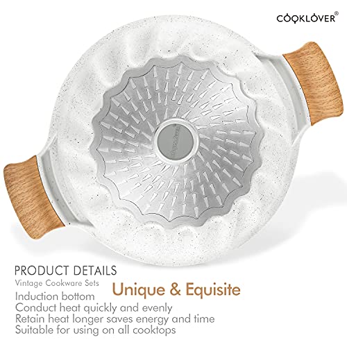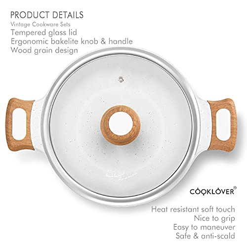 ►ERGONOMIC BAKELITE KNOB AND HANDLE ►COOKLOVER’s cookware sets builds with heat resistant soft touch silicone Bakelite knob and handle with beautiful wood grain design (NOT REAL WOOD).