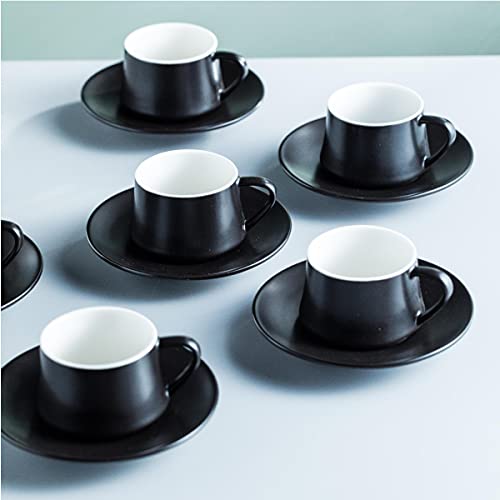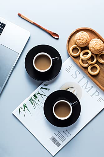 NOVEL DESIGN STYLE: Espresso cup’s unique smaller upper cup rim conduce to keep the coffee/tea warm and flavor. Saucers have a groove in the middle that adapts to the stacking of cups, and the cups and saucers will not slide when you hold the set. Every saucer can also be used for holding a coffee spoon, sugar, milk packet or dessert.