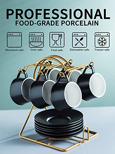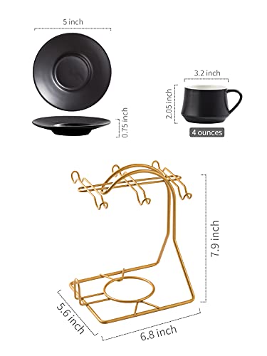 Gomakren Espresso Cups with Saucers Set of 6 with Stand, 4 oz Cappuccino Espresso Latte Coffee Small Cup Black Demitasse…