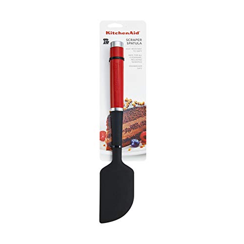 This KitchenAid silicone scraper spatula is ideal for scraping that list bit of batter out of mixing bowls or mixing various ingredients. The silicone scraper spatula is safe for all cookware, including nonstick and is heat resistant to 500°f/260°c. The scraper spatula’s head substrate is constructed of 30% glass reinforced nylon with a silicone over-molded, making it strong and durable for use in the kitchen. The glossy ABS handle features a debossed logo, as well as an ABS satin chrome plated bolster and end cap. Dishwasher safe for easy cleanup. One year hassle-free replacement and lifetime limited .