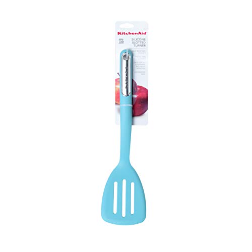 This KitchenAid Aqua Sky silicone slotted turner is perfect for flipping pancakes, grilled cheese, eggs, hash browns, and more. The slotted head lets juices drain back into the pan before transferring foods like burgers and fish to a plate. The flexible silicone head is heat resistant to 450 degrees F, and safe to use on all cookware, including nonstick. Measures 13-1/2 inches long. Dishwasher safe.