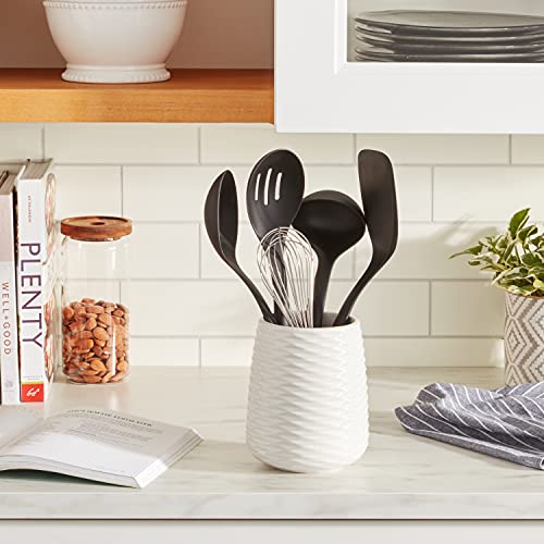 This KitchenAid kitchen tool set includes all the essentials – a solid turner, basting spoon, slotted spoon, ladle, utility whisk with a ceramic storage crock