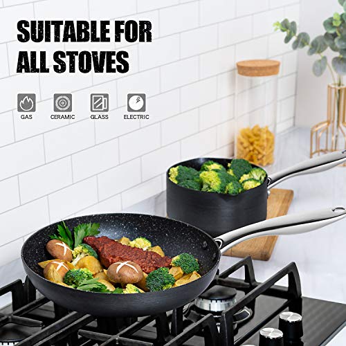 NON-TOXIC FOR HEALTHEY COOKING – The natural mineral nonstick coating of the kitchen cookware setis ultra durable while remaining 100% free of PFOA, PTFA, lead, and cadmium, ideal for healthy cooking. Oven safe up to 450F.