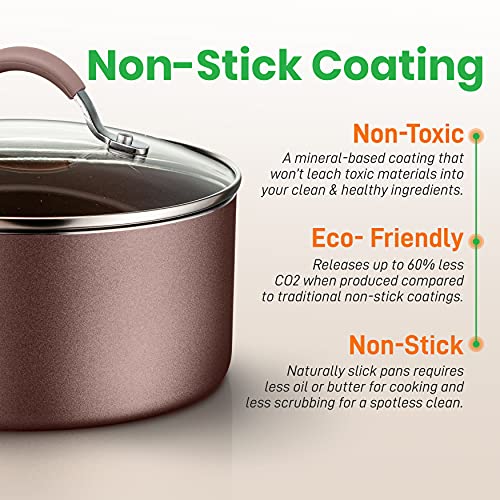NON-STICK COATING: The PTFE/PFOA/PFOS-free non stick pot set cooking ware features a long lasting nonstick coating for easy food release or tossing, cleaning & healthy cooking w/ heat resistant lacquer exterior making it resistant to high heat