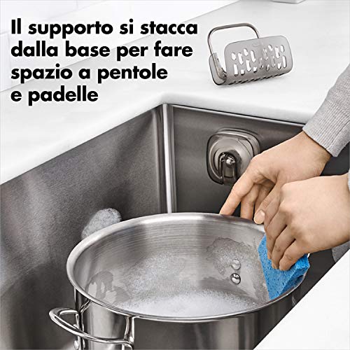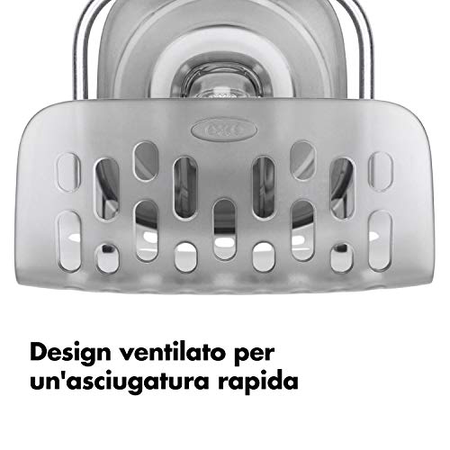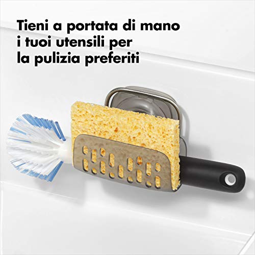 Keep your favorite sponge, scrubber or dish brush out of sight but close within reach with the OXO Good Grips StrongHold Suction Sponge Holder. The Holder locks into place with the push of a lever and can be removed from the phthalate-free suction base to make room for larger pots, pans and dishware. The ventilated design promotes fast, sanitary drying. Dishwasher safe.