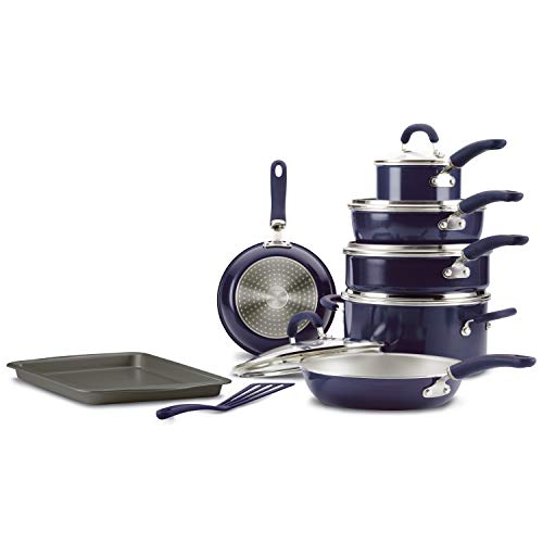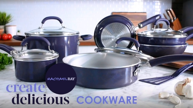Radiant and solution-oriented, the Rachael Ray Create Delicious 13-Piece Aluminum Nonstick Cookware Set brings high performance and easy convenience to home chefs. Featuring vibrant, shimmering color combined with functionality, this collection of essential pots and pans by Rachael Ray is constructed of durable aluminum for even heat distribution to reduce hot spots. The cookware set features enhanced PlatinumShield Technology nonstick reinforced to be 9 times harder than titanium for effortless food release. Plus, all of the pots and pans are dishwasher safe for quick and easy cleanups. Colorful, dual-riveted stainless steel and silicone handles provide comfort and control that’s oven safe to 400°F. Flared cookware rims make for easy pouring, and an induction-compatible stainless steel base provides strength, durability, and versatility to use the pots and pans on any cooktop. Included in the 13-piece set, a 9-inch x 12-inch cookie sheet is ready for chicken wings and cookies alike, and the nylon turner utensil will have you ready to flip and serve from the get-go. From dishwasher-safe convenience to enhanced durability of PlatinumShield nonstick, reach for the Rachael Ray Create Delicious 13-Piece Aluminum Nonstick Cookware Set.
