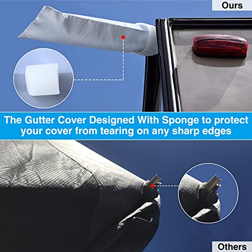 [DURABLE & WATERPROOF]: Made of 150d high density polyster with silver coating + corner reinforcements at front and rear + all double stitch seams, protect your RV from scratch, dust, rain, snow, and UV rays; Provide Gutter Cover with Sponge design, Prevent sharp objects from piercing your rv cover, prolong servce life.